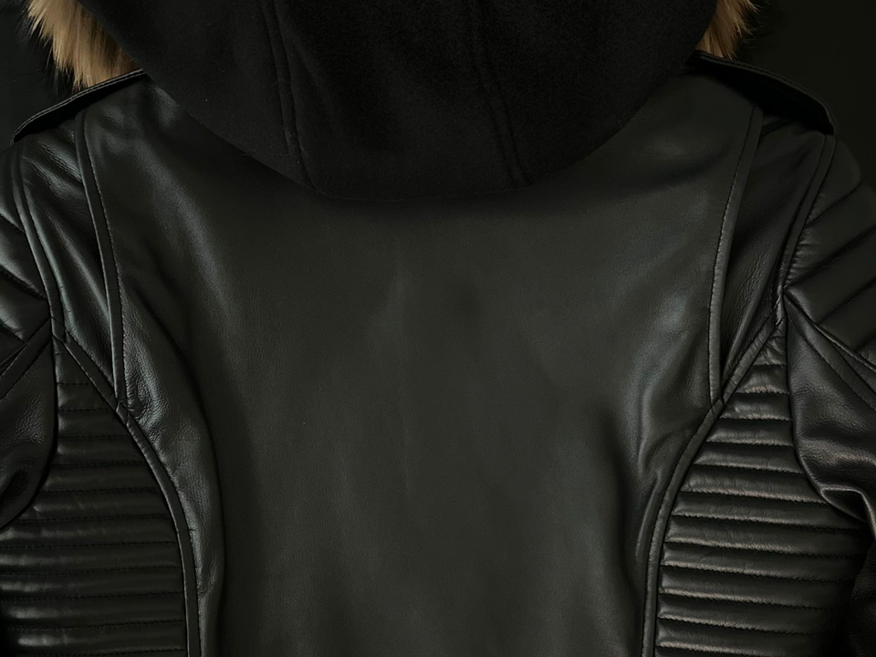 LEATHER JACKET THAT EMBRACES YOU WITH ITS ROBUST, LUXURIOUS TEXTURE. THE SNUG FIT THAT HUGS & COZY HOOD THAT KEEPS YOU WARM TO BREAK THE WIND - THAT'S ALL A WOMAN WANT.